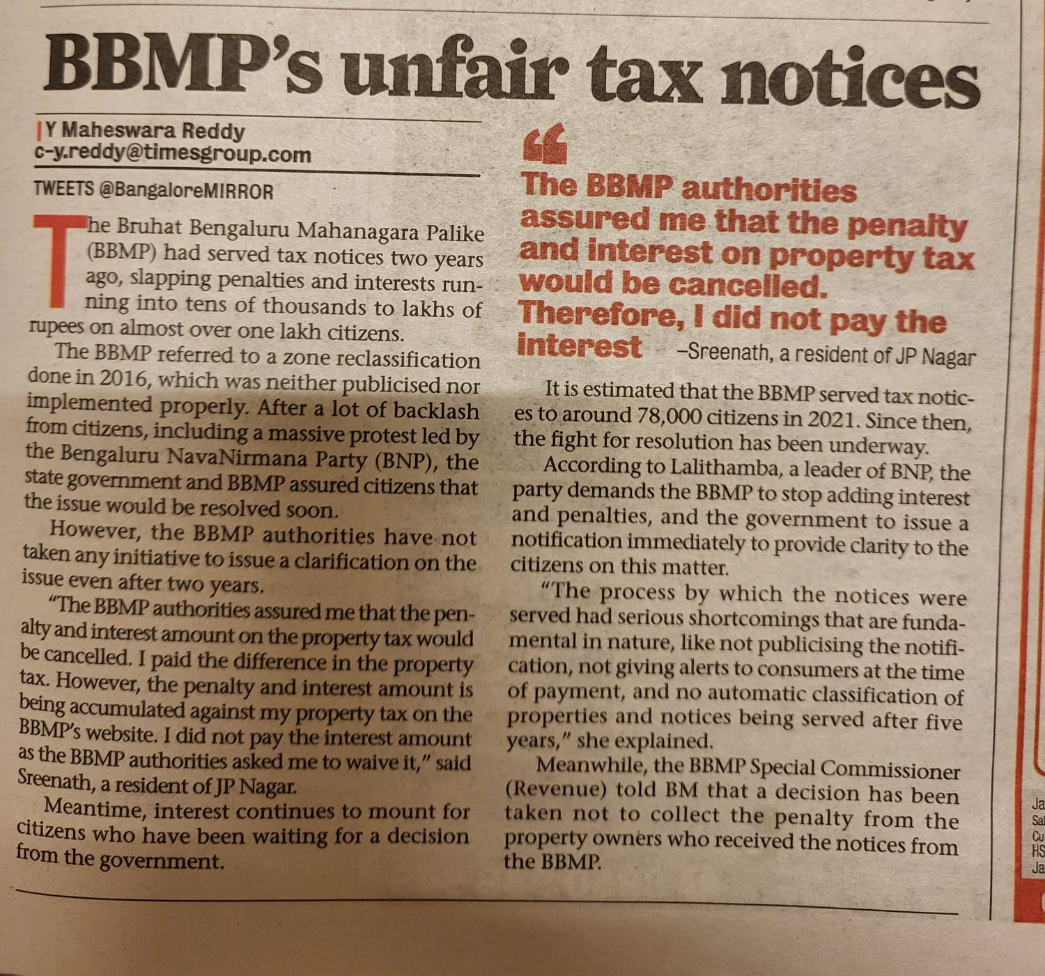 BNP IN THE NEWS Home /BNP In The News/Page 5 Bengaluru MP Tejasvi Surya defaced public property with BJP logo, alleges BNP admin • February 1, 2023 • • No Comments Read More… https://nammabnp.org/wp-content/uploads/2023/02/TEJASWI-SURYA-1.mp4 BBMP’s unfair tax notices admin • January 24, 2023 • • No Comments READ MORE Residents in Gururaja Layout (ward no. 85) complain about the BBMP’s negligence admin • January 24, 2023 • • No Comments READ MORE BNP opposes BBMP’s move to widen Sankey Tank Bund Road in Bengaluru admin • January 22, 2023 • • No Comments READ MORE BNP has been raising its voice against encroachments admin • January 21, 2023 • • No Comments READ MORE BNP’s dream of sustainable transportation could soon be a reality admin • December 29, 2022 • • No Comments READ MORE BMLTA bill passed in the Karnataka Assembly admin • December 29, 2022 • • No Comments READ MORE BNP fights for pedestrian’s rights admin • December 20, 2022 • • No Comments READ MORE 2 mobility bills to streamline traffic in Bengaluru yet to get nod admin • December 14, 2022 • • No Comments READ MORE Thippasandra’s road to ‘future craters’ admin • November 17, 2022 • • No Comments READ MORE Thippasandra residents complain of bad road work admin • November 17, 2022 • • No Comments READ MORE Asphalting work in Thippasandra shoddy, says Bengaluru political outfit admin • November 16, 2022 • • No Comments READ MORE