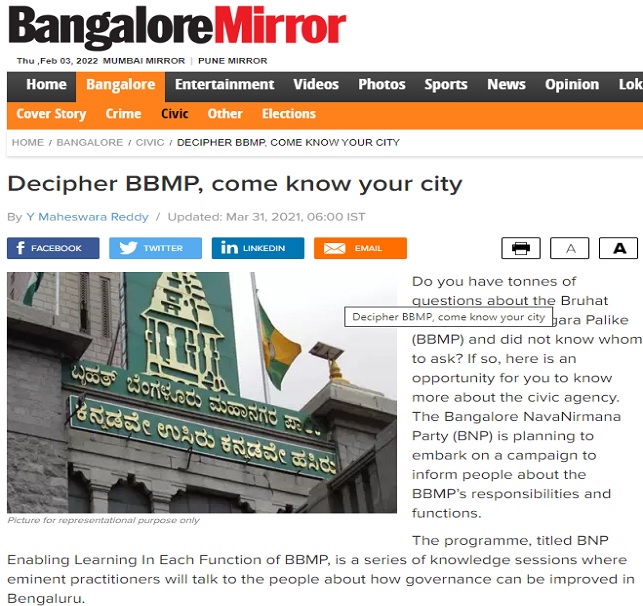 BNP IN THE NEWS Home /BNP In The News/Page 9 Parking woes spill over to several residential areas admin • February 5, 2022 • • No Comments READ MORE Table BMLTA Bill in coming session, BNP urges Bommai admin • February 4, 2022 • • No Comments READ MORE Decipher BBMP, come know your city admin • February 3, 2022 • • No Comments READ MORE Multiplicity admin • December 24, 2021 • • No Comments READ MORE IIM Graduate forms political party admin • December 13, 2021 • • No Comments READ MORE Nodal officer? Sorry, wrong number admin • December 2, 2021 • • No Comments READ MORE Coming soon, BBMP election admin • December 2, 2021 • • No Comments READ MORE BNP opposes amendment if 4(g) clause of KTPP Act admin • December 2, 2021 • • No Comments READ MORE BNP alleges lacunae in ₹120 crore expenditure of ward grant admin • November 19, 2021 • • No Comments READ MORE LekkaBeku – Coverage in other languages admin • November 19, 2021 • • No Comments READ MORE BNP protests in front of BBMP office, online against ‘unfair’ tax notices admin • November 19, 2021 • • No Comments READ MORE Decentralise, activate ward committees to tackle second wave admin • November 19, 2021 • • No Comments READ MORE